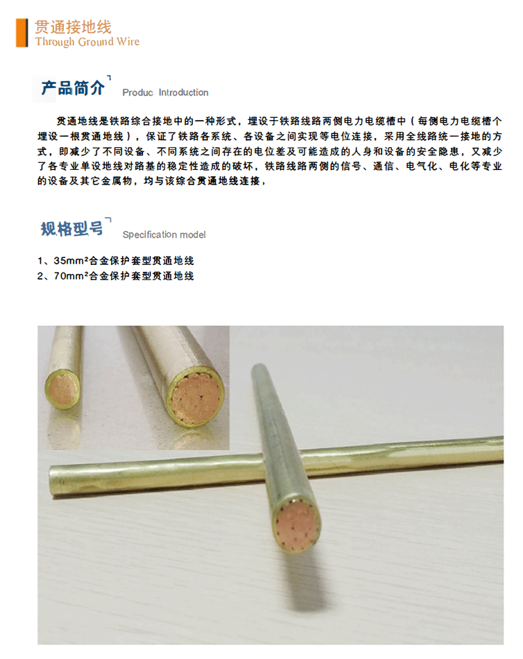 貫通地線是鐵路綜合接地中的一種形式,埋設(shè)于鐵路線路兩側(cè)電力電纜槽中(每側(cè)電力電纜槽個(gè)埋設(shè)一根貫通地線),保證了鐵路各系統(tǒng)、各設(shè)備之間實(shí)現(xiàn)等電位連接,采用全線路統(tǒng)一接地的方式,即減少了不同設(shè)備、不同系統(tǒng)之間存在的電位差及可能造成的人身和設(shè)備的安全隱患,又減少了各專業(yè)單設(shè)地線對(duì)路基的穩(wěn)定性造成的破壞,鐵路線路兩側(cè)的信號(hào)、通信、電氣化、電化等專業(yè)的設(shè)備及其它金屬物,均與該綜合貫通地線連接。